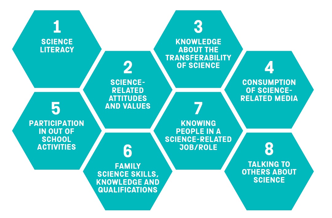 The research into science capital has identified eight dimensions of science capital. These are the most influential and significant science-related experiences, knowledge, interests, behaviours and attitudes that people have, and which affect how much science capital they have. Understanding what these influences are can help us to design and deliver learning opportunities which can help more people to engage with science.