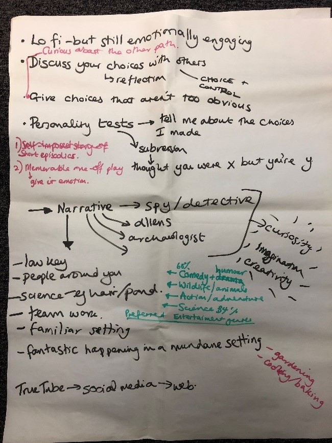 Out of this workshop came the strong foundations for our brief for production: this product needed to be a narrative-driven experience that gave users choice over their actions, allowed for the reflection of the science skills that they use every day and is more about personal reflection than recalling facts or concepts. We came up with several example narratives that could be used for the game, but we were open to new ideas as well, along with examples of other games that had aspects we liked and could be used for inspiration. We wanted the outcome to be an emotionally resonant experience which provokes a change in attitude and some kind of ‘aha moment’ where a player makes the link between what they do in the game and in their own lives, all within an engaging storyline.